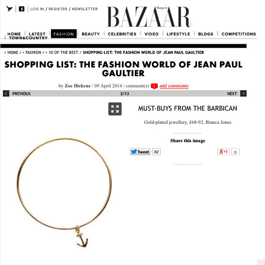I’m beyond thrilled to share that my Bianca Jones Gold Vermeil Anchor Bangle has made it onto Harper's Bazaar's Must-Buy List, featured in connection with the Barbican’s Jean Paul Gaultier exhibition. Being a part of this prestigious list is truly a dream come true!